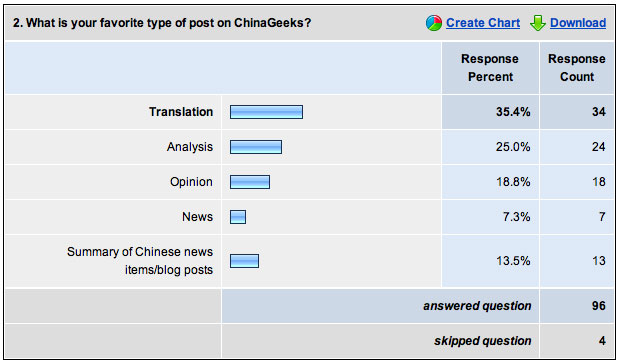 Unbeknownst to us, a “free account” only allows you to view the results of your survey’s first hundred respondents. Moreover, it also apparently makes an annoying sales pitch at the end for everyone who takes the survey — apologies. So that makes this, ChinaGeeks’s first ever reader survey, a bit of a misfire. Next time around, we’ll find something that’s less annoying than SurveyMonkey and do a more thorough survey.