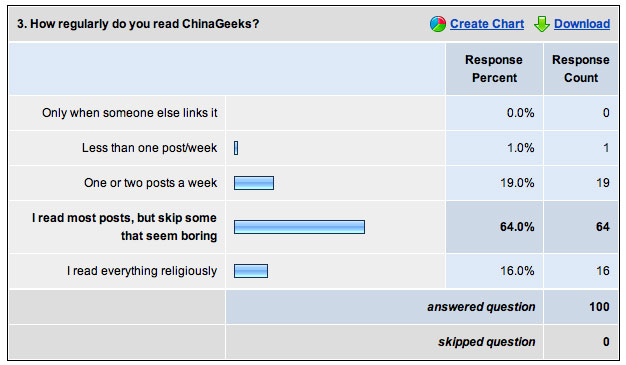 The first option in this question makes no sense at all, since people who only read posts linked by other sites would never have seen the post about the survey to begin with (we already had a hundred responses before the end of that day, so anyone who responded after clicking one of the links in yesterday’s post, for example, isn’t reflected in these data). I am surprised by the percentage of people who say they read most ChinaGeeks posts, but on the other hand, those who chose to fill out a survey are obviously a rather self-selecting crowd in the first place.