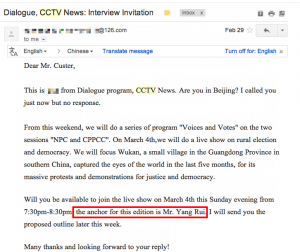 My message (see the image) was titled “Fire Yang Rui!” and contained a summary of his own post, an image of him labeled “Xenophobe,” and this: “These vicious lies do not represent the vast majority of foreign citizens in China. It is extremely insulting that an anchor on CCTV Dialogue, a show that is meant to be about intercultural exchange, would propagate such racist, hateful speech.” The language, I’ll admit, is a bit extreme, and if I could do it over, I might tone down the tone slightly. But I wouldn’t change the meaning of any of it.