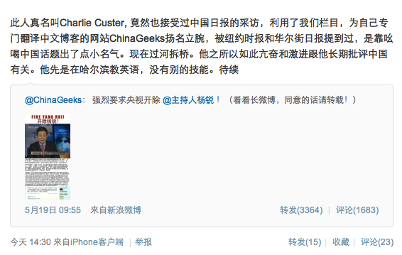 Yang’s opponent in his Weibo war of words is the young American writer and filmmaker behind popular blog China Geeks, Charlie Custer. Custer labeled Yang a “xenophobe,” called for him to be fired and urged a boycott of foreign guests on his program, Dialogue. It’s an emotional, knee-jerk response that would further restrict free speech in our media and encourage TV hosts to be dull and unopinionated.