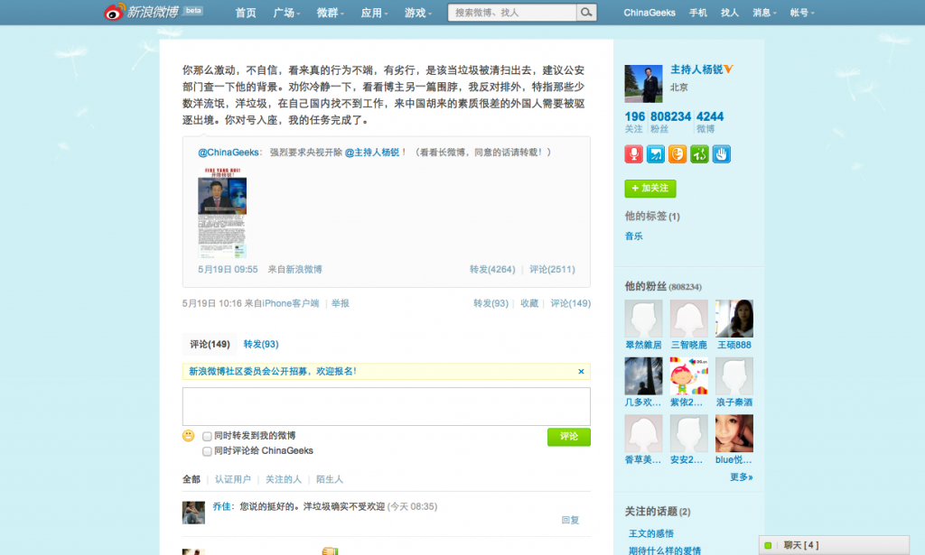 Shortly after writing my initial post, I was contacted by several other foreign bloggers in China about a campaign to draw attention to Yang Rui’s comments. We settled on calling for him to be fired, not because we thought it would actually happen, but because it would put some heat on him and possibly even his employers, and maybe cause someone up there to think for a second about the repercussions of extreme rhetoric like this. I happened to be the first person to post one of our messages on Sina Weibo, and although I expected that to go nowhere — I had barely 300 followers, and most of them were probably zombies3– Yang Rui himself picked up on my post more or less immediately, and retweeted it to his 800,000+ followers.